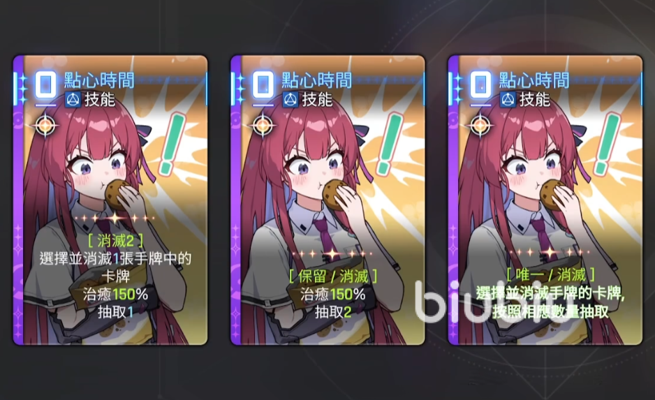 接着再来看一下她的关键技能—最后的暗影,这是一个控制性的输出技能,适合在敌人聚集时使用,并能用来打断敌人的动作,为队友创造输出机会。所以当敌人开始凝聚大招或者攻击时,就可以暂时延缓他们的进攻,接着就能继续发起总攻。她还有个保命技能叫做点心时间,可以通过消灭手牌来治愈自身并补充抽牌。这样就能源源不断的恢复血量,还可补充更多强力卡牌。