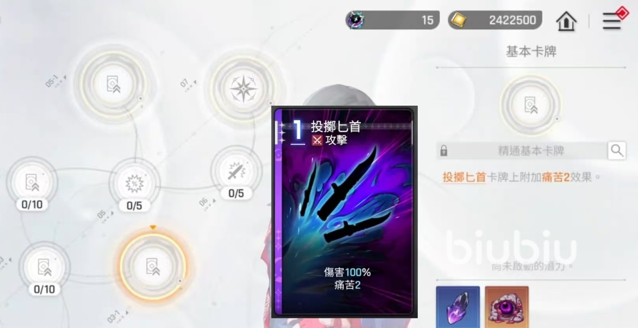 第2张是附加诅咒,1回合内使用攻击卡牌时,赋予目标痛苦2。如果是先用附加诅咒,再使用暗影匕首,对方头上就会有两个痛苦2。第3张是暗影上膛,100%治愈,且生成1张高阶暗影匕首。高级暗影匕首比暗影匕首要更加好用,每当高阶暗影匕首第1次使用完后,都会回到手牌中,并且可以马上再使用一次。第4张攻击要害,打出三次80%的伤害,如果目标处于痛苦状态,则伤害量增加50%。第5张切除诅咒,伤害160%,中毒2,削弱2。
