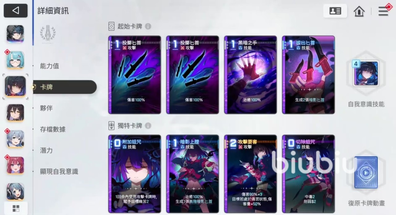 德蕾莎这个角色是目前游戏中唯一的DOT体系核心,它是四星的虚无属性心灵术士。自我意识技能黑暗之波,生成3张暗影匕首,削弱2,痛苦4x2。基本卡牌组合是两张1费攻击和一张1费治疗。特殊卡牌方面,第1张是拔出匕首,生成两张暗影匕首。暗影匕首是属于0费的攻击牌,伤害50%,痛苦2。痛苦可以说是德蕾莎最主要的伤害来源,在回合结束时,敌人身上的每个痛苦,都会造成固定持续伤害,触发伤害之后痛苦数减1。