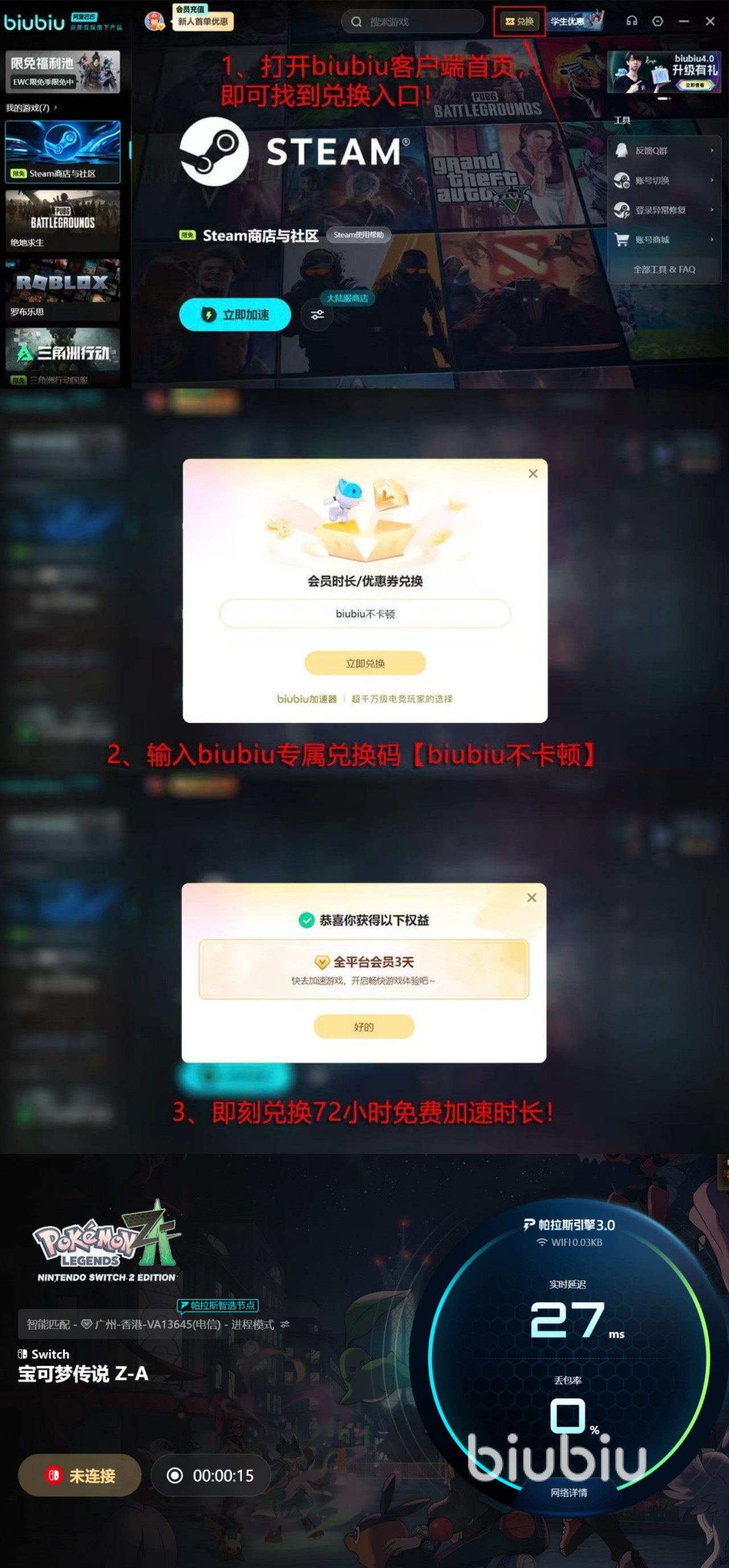 为了解决这个问题,不少有经验的训练师会选择使用专业的游戏加速工具。目前,biubiu加速器为了提升玩家的游戏体验,进行了重磅升级,引入了全新的帕拉斯引擎3.0,这项技术据称是与冠军选手Aixleft合作打造的,能够有效优化网络连接,减少游戏中的延迟现象。此外软件福利也不错,对于新用户来说,注册后就能享受到免费加速24小时的福利,足以应对此次挑战。同时,无论是新老用户,使用兑换码【biubiu不卡顿】都可以额外获得3天免费加速时长,这能让你的冒险之旅更加顺畅。