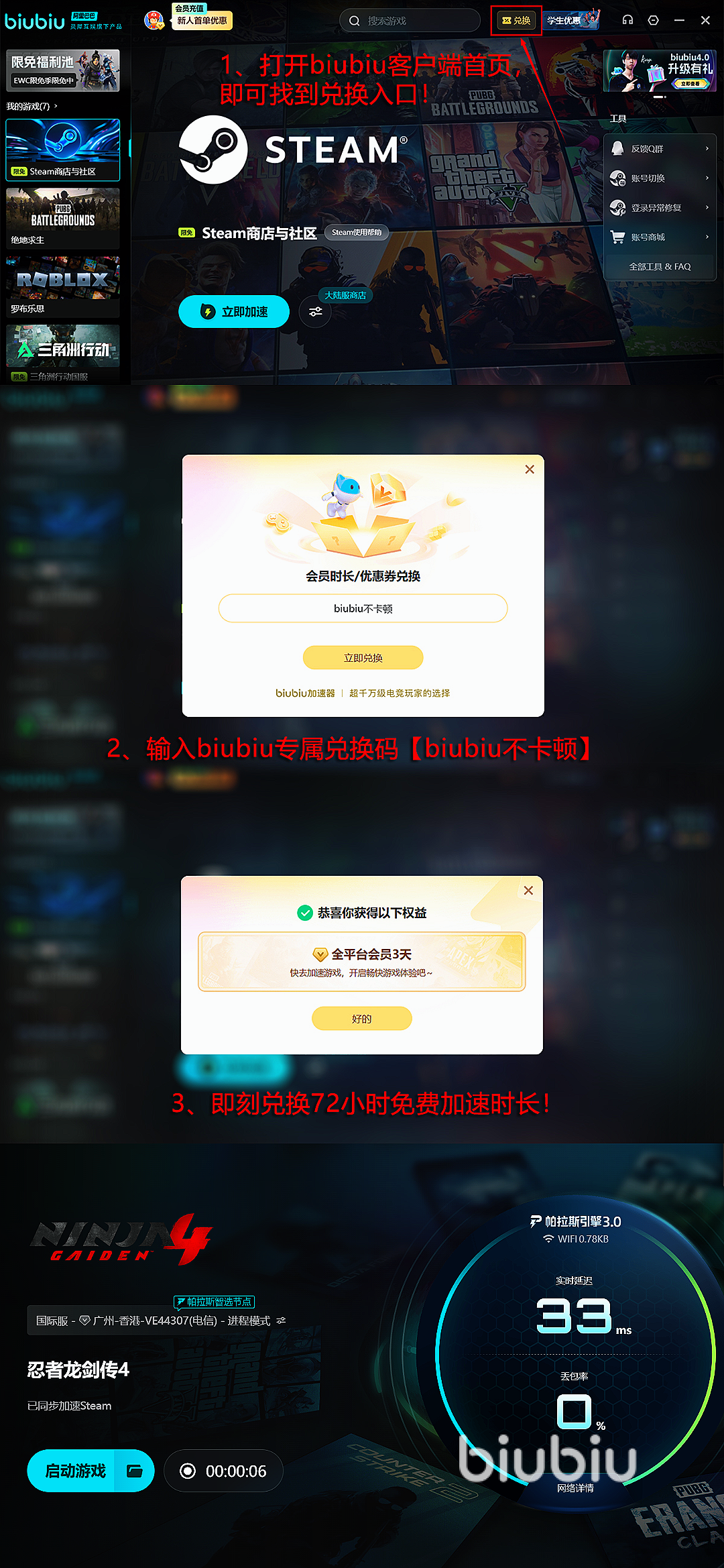 此外豪华版还包含两套皮肤道具,分别是八云的“邪神剑”皮肤和“神圣奇美拉”武器套装,为角色外观提供更多个性化选择。部分玩家在游玩时若感觉画面卡顿或操作延迟,可使用biubiu加速器一键加速,新人注册后能获得24小时免费加速时长,轻松体验忍者世界的战斗乐趣;新老用户使用兑换码【biubiu不卡顿】,还可额外领取3天免费使用权,彻底解决网络问题带来的困扰。
