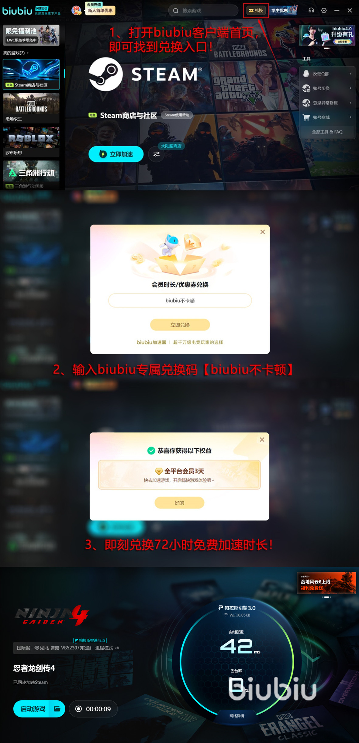 对于喜欢玩这款游戏的玩家来说,biubiu加速器优化功能非常重要。升级之后使用帕拉斯引擎3.0的biubiu,还邀请到了冠军选手Aixleft加入进来一起打造。现在支持新注册号直接免费加速24小时,还推出了一个新老账号都能用一次的兑换码【biubiu不卡顿】,能兑换三天加速时间。在忍者龙剑传4中,主要角色是八云和隼龙,其中八云是新设计的角色,可以同时进攻和防御,除了传统武器之外,还能使用血忍术战斗。隼龙是前作中的主角,经过改良之后重新回归。