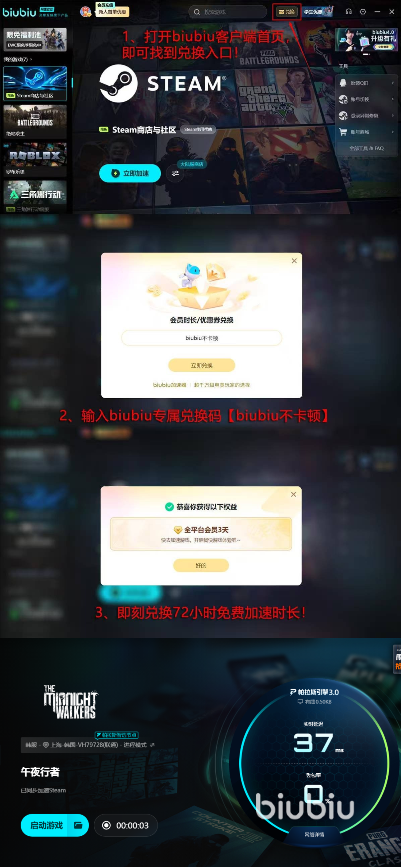 考虑到有的用户之前没有用过这个软件,平台给大家提供了不少福利,比如新用户在登录的时候会得到平台直接发放的24小时的体验机会,注册即可领取。同时还给全体用户提供了三天的体验时长,这个需要玩家自己手动通过【biubiu不卡顿】在平台的指定兑换区域输入领取。