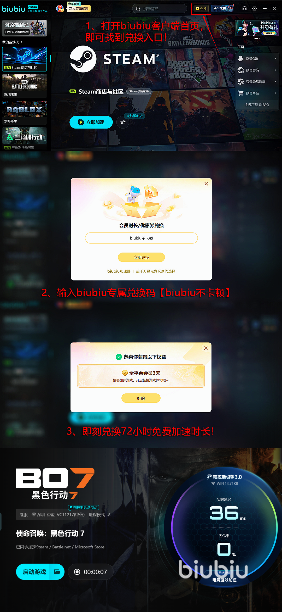 部分玩家在游玩使命召唤黑色行动7时会出现卡顿问题,尤其是联机对战时,可能直接卡在原地无法移动,不仅影响自身体验,还会拖累队友的进攻节奏,这类问题多由网络波动或延迟过高导致。此时可使用biubiu加速器进行全面加速,新人注册后能获得24小时免费加速时长,有效改善网络稳定性,让玩家与队友形成更紧密的配合;新老用户使用兑换码【biubiu不卡顿】,还可额外领取3天免费使用权,保障持续流畅的联机体验。