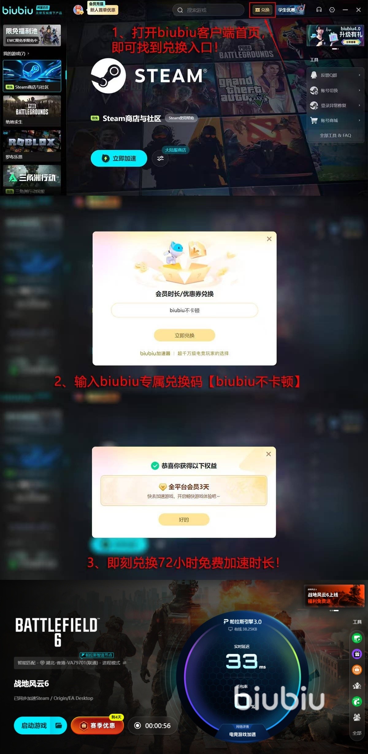 值得一提都是,当各位作为平台的新用户时,首次登录可以领取到为期24小时的加速时长,对于广大小伙伴们而言,试用机会若是不够,还可主动去点击兑换,再借助【biubiu不卡顿】在兑换界面去领取72H的加速,确保大家去长时间体验,而不用担心会卡死。