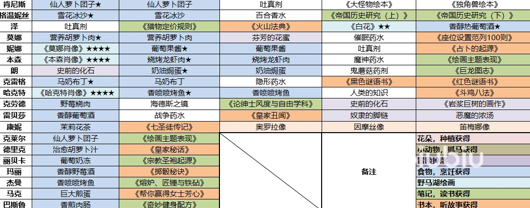 另一位角色妮娜,她的喜好相对集中。她最喜欢的是《占卜的起源》,赠送此书可增加10点好感;其次是“葡萄果酱”,可提升8点好感。此外,“吐真剂”也是她较为喜爱的物品之一,适合用于日常互动中增进关系。
