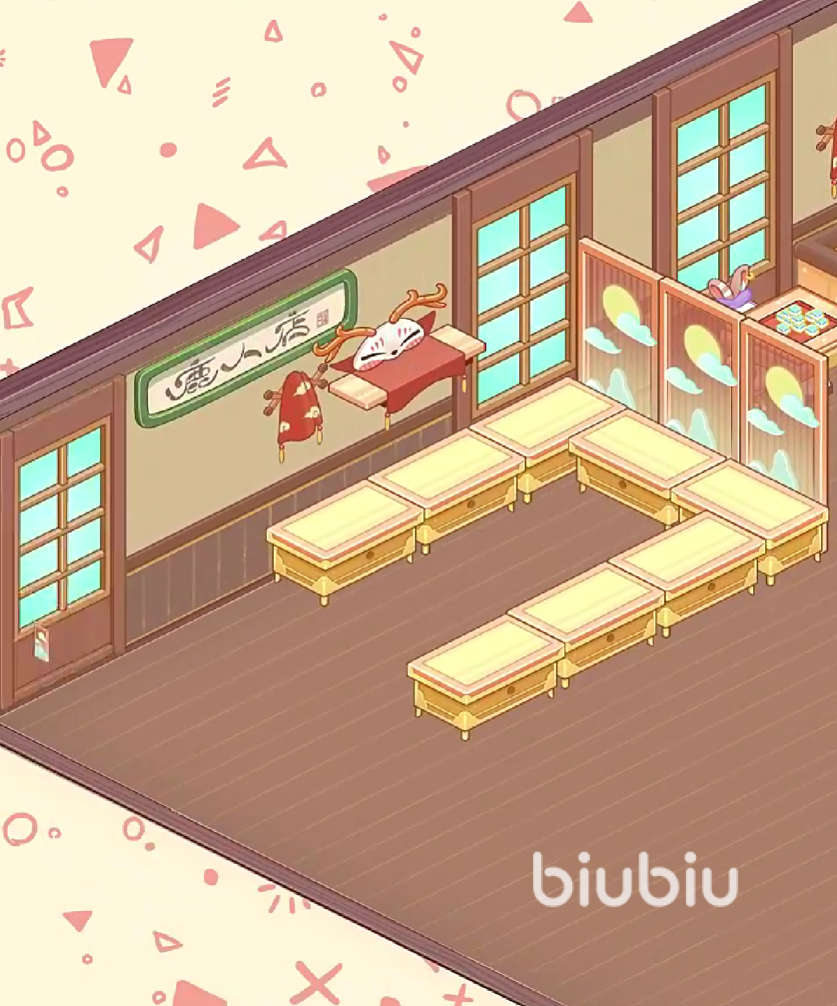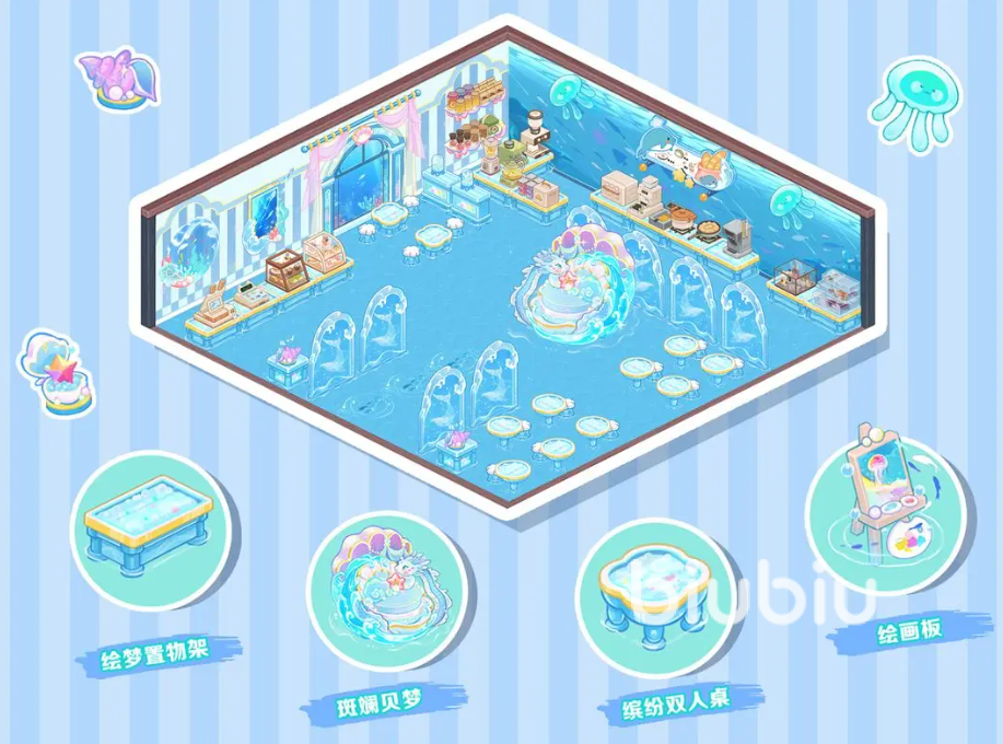 这套家具最大的亮点在于其无需氪金即可获取,并且整体设计走的是清新的自然路线。无论是色彩搭配还是材质纹理,都透露出一种贴近大自然的舒适感。木质元素与柔和色调相结合,非常适合打造田园风或森系主题的餐饮小店,让整个空间显得温暖而治愈。