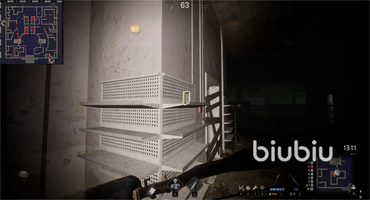 10L中下方有I7,15L正下方E4,饰品店位于2L正下方F2,黑市的账本位于15L正下E2,损坏的怀表在2L右上G8位置,失踪的实习生位于7L右下角H3尸体堆附近,复杂空间7L精英位置H7走到铁架上面,车辆获取B1L左上角C10,武器训练手册上册11L右下H4,训练手册下册11L右下H4,11L还有健身指南可以摸到。