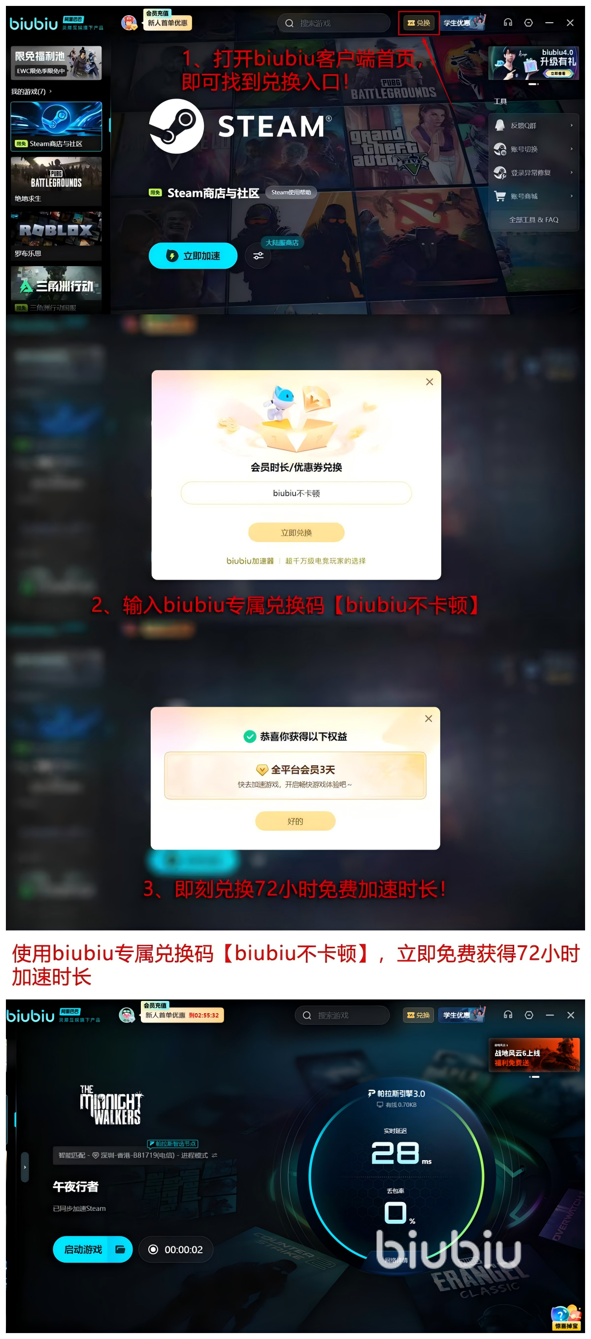 当今市面上非常受欢迎的一款加速器biubiu绝对可靠,软件常常会回馈玩家许多的福利内容,还没体验过的玩家,可用【biubiu不卡顿】口令,在右上角【兑换】到3天福利,并且如是各位是新用户注册,则还能再得到24小时福利,总计能够得到96小时,如果各位是羊毛党那么一定能为各位带来非常多的好处。