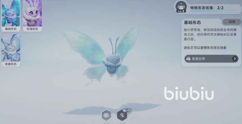 此外还有夜晚专属形态,此状态下其翅翼荧光由蓝转为淡蓝色,并伴随移动轨迹产生闪烁光效,营造出梦幻般的氛围。不同形态需在特定条件下才能触发捕捉:例如花海形态需等待花海区域起风时才可遇见,而夜晚形态则必须在游戏内时间设定为晚间方可现身。这些条件也直接影响后续的研究方向选择。
