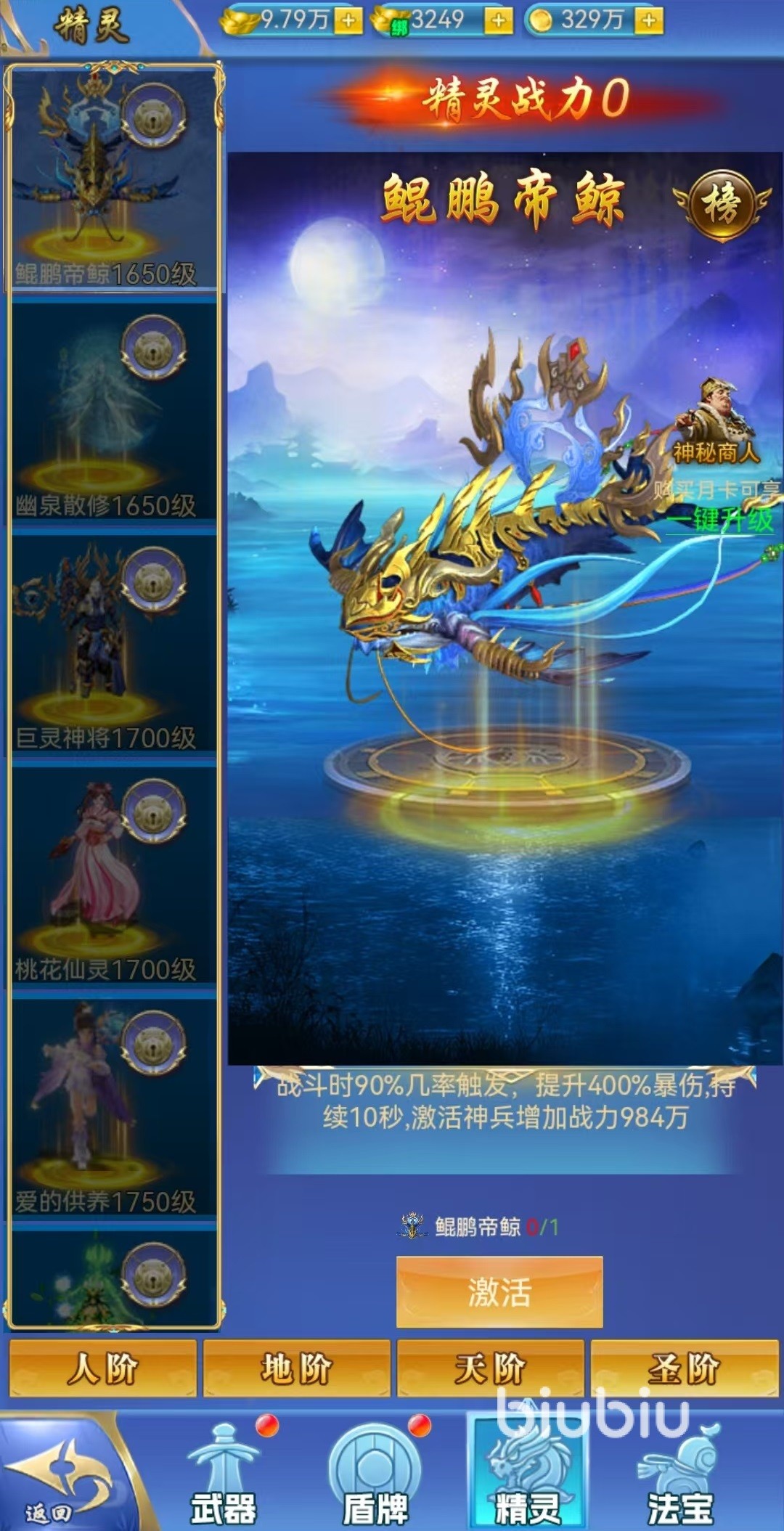 盾牌类代表神器包括钢铁之心、幽狼咆哮与龙鳞玉玺。钢铁之心触发后可大幅提升爆伤减免能力,有效提升生存性;幽狼咆哮则侧重输出强化,激活后提升超爆属性;龙鳞玉玺主要增强韧性,减少被控几率。精灵方面,鲲鹏帝鲸可提高爆伤输出,幽泉散修强化超爆伤害加成,桃花仙灵则带来伤害加深的被动增益。至于法宝,盘古开天斧、太初清萍剑、太上造化炉等顶级神器通常需通过限时活动获取,稀有度高且效果卓越。