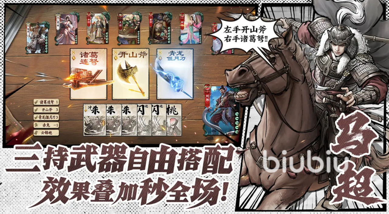 为了提升战斗策略的多样性,每位角色最多可装配三张不同类型的武器装备卡,例如诸葛连弩、开山斧、青龙偃月刀均可同时携带,搭配不同武将技能可产生多样化的战术组合。