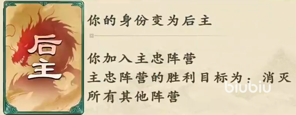 先主具备公布身份的能力,当自身阵亡时可指定一名角色转化为后主,使其恢复3点体力并抽取3张手牌。先主与其他主公类身份不可共存于同一对局。若反贼被转为后主,忠臣的胜利条件将调整为击败该后主;而反贼则需转为保护状态。其他非主忠角色成为后主后,直接归入主忠阵营并更新胜利目标。