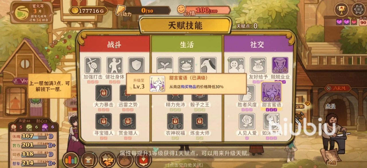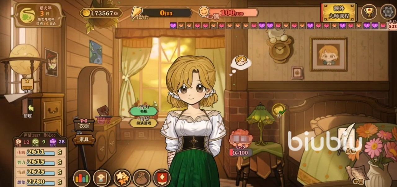 每次为女儿安排活动都会消耗行动力,不同项目所需消耗的行动力各不相同。当行动力归零时,无法继续执行任何指令。但玩家可以通过天赋加成、休息恢复等方式补充或提升行动力上限。属性成长不仅依赖课程安排,还能通过多种趣味小游戏和事件互动实现提升,成长途径多样,允许玩家将所有属性点培养至满级状态。强烈的交互体验让整个养成过程更具真实感,带来满满的成就感。