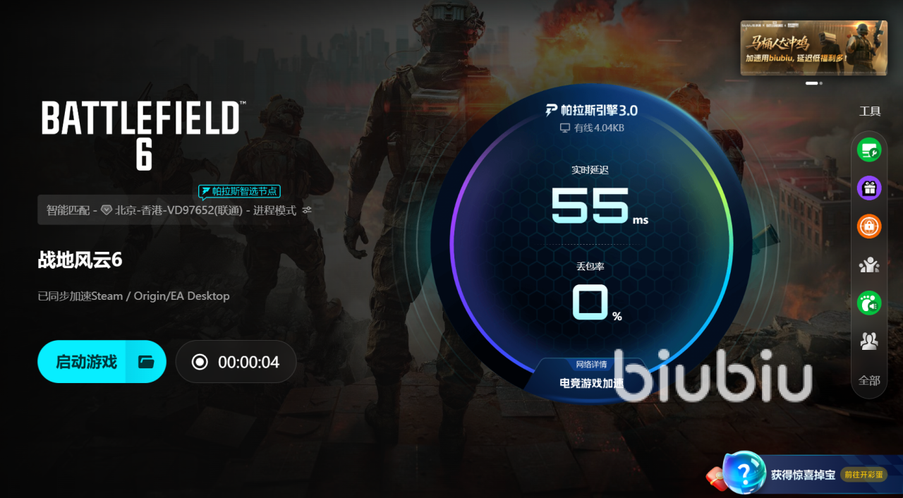 解决战地6闪退问题的关键在于优化网络传输路径。biubiu加速器为该作提供专属加速通道,依托智能调度系统重新规划数据流向,避开拥堵节点,确保信号以最短路径直达目标服务器。启用加速后,服务器响应更迅速,资源校验流程顺利完成,避免因瞬时延迟波动被系统误判为异常连接。新用户注册即可领取二十四小时战地专用加速时长,进入加速页面输入口令【biubiu不卡顿】还可额外获得七十二小时加速服务,充分满足连续作战需求。