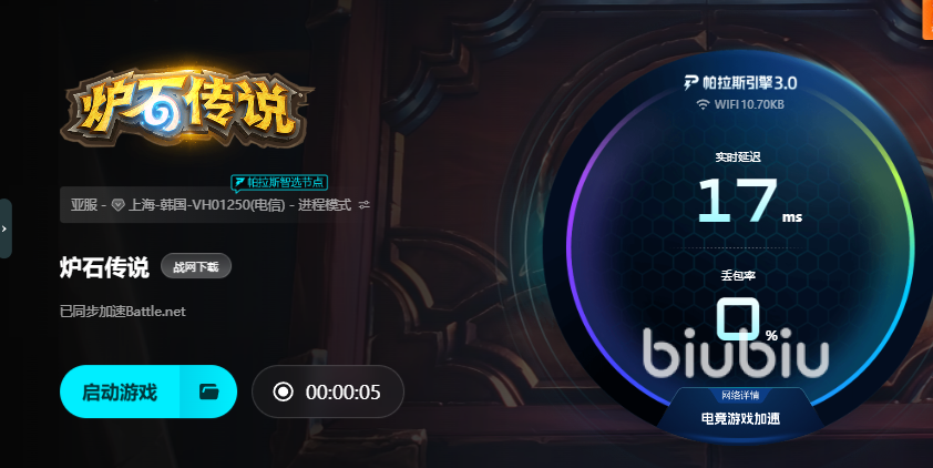 为提升网络连接的稳定性,越来越多玩家选择使用专业游戏加速工具。其中,biubiu加速器凭借其优化的网络架构和高效的技术支持,成为解决炉石传说闪退问题的有效方案之一。该加速器通过搭建专属的游戏加速通道,帮助玩家实现与服务器之间的直连通信,大幅降低延迟和丢包概率。
