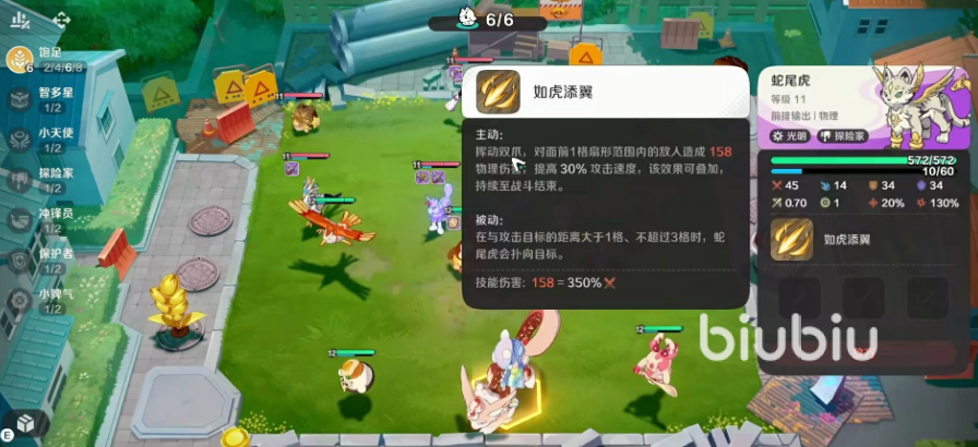 蛇尾虎的核心技能名为如虎添翼,该技能包含主动与被动双重机制。主动释放时,它会以双爪发动一次近战攻击,对前方扇形区域内的敌人造成158点物理伤害。由于攻击范围仅限于前一格的扇形区域,因此在实际战斗中需要精准把控站位,确保目标处于有效打击范围内,否则输出效率将大打折扣。