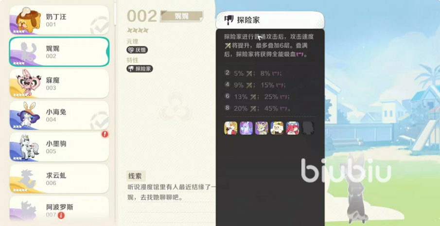 此外,娓娓的“探险家”特性在持续普攻下可叠加攻速层数,最多叠加6层。叠满后不仅能大幅提升输出节奏,还会激活全能吸血效果,最高可达45%的生命回复比例,显著增强续航能力。结合厌憎元理与探险家双重增益,娓娓在输出与生存两端均表现出色。尽管当前厌憎系精灵数量有限,难以轻易达成满羁绊配置,但随着后续版本更新,预计会有更多适配角色加入,届时阵容构建将更加灵活多样。