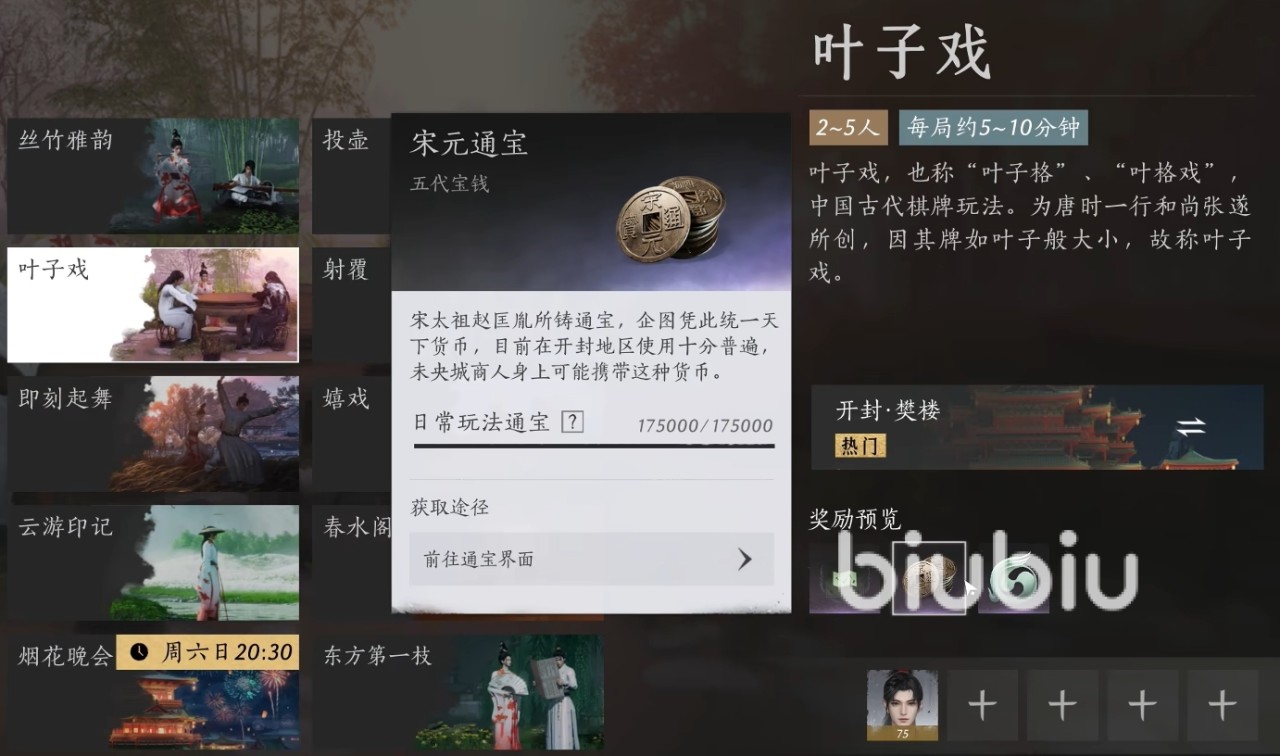 日常活动同样是补充宋元通宝的重要来源。目前可通过叶子戏和雀神争霸两项玩法获取,奖励将根据参与时间累计发放,并设有每周获取上限,达到上限后无需重复进行。若当周尚未用完周元通宝的兑换额度,还可优先参与能获取周元通宝的日常项目,随后通过兑换系统将其转为宋元通宝,进一步提升资源利用率。