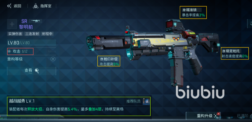 除了武器本身的属性外,养成系统也是不可忽视的一环。武器可通过升级和突破来提升上限。每当武器达到30级、40级、50级、60级和70级时,均可进行一次突破操作。例如,若指挥官等级未达35级,则武器最高等级将被锁定在30级。完成突破后,不仅等级上限提高,还会开放新的配件装配权限。每个配件的解锁条件各不相同,需在装备界面逐一查看并满足相应要求,以此实现全面强化。