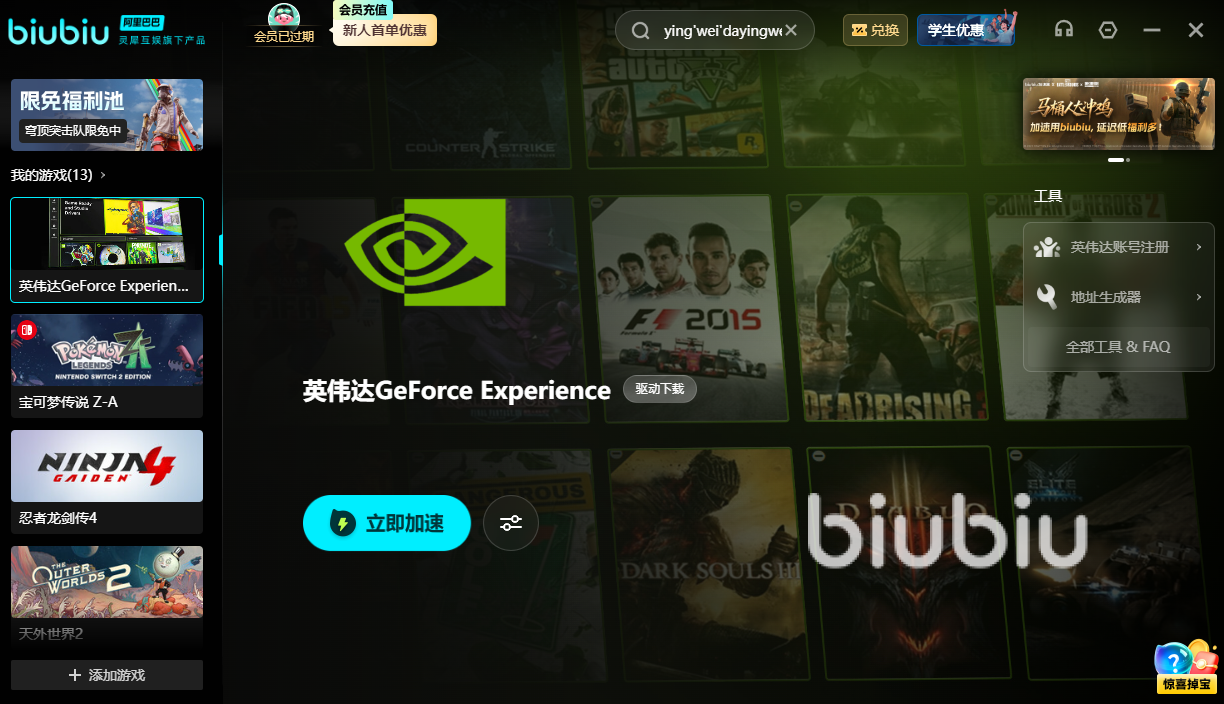 方法三,游戏的驱动配置,现在的游戏都支持最新的DLSS功能,所以驱动的强度影响游戏的正常运转,大家的驱动可能没有达到最新的驱动,可以打开biubiu加速器搜索英伟达驱动以此更新玩家的驱动,并且还能搜索忍者龙剑传4后台加速网络,减少游戏因为网络不良导致的卡顿。