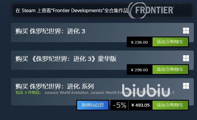 此外还有捆绑包可以进行购买,包含了侏罗纪世界进化系列前三作,如果小伙伴们其他系列也想体验的话,可以考虑购买这一类,折后的价格为493.05元,适合才接触这个作品的新玩家一次性体验。