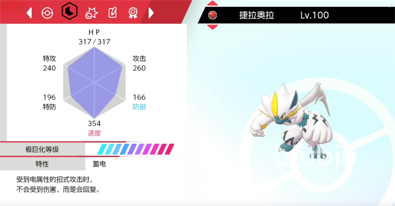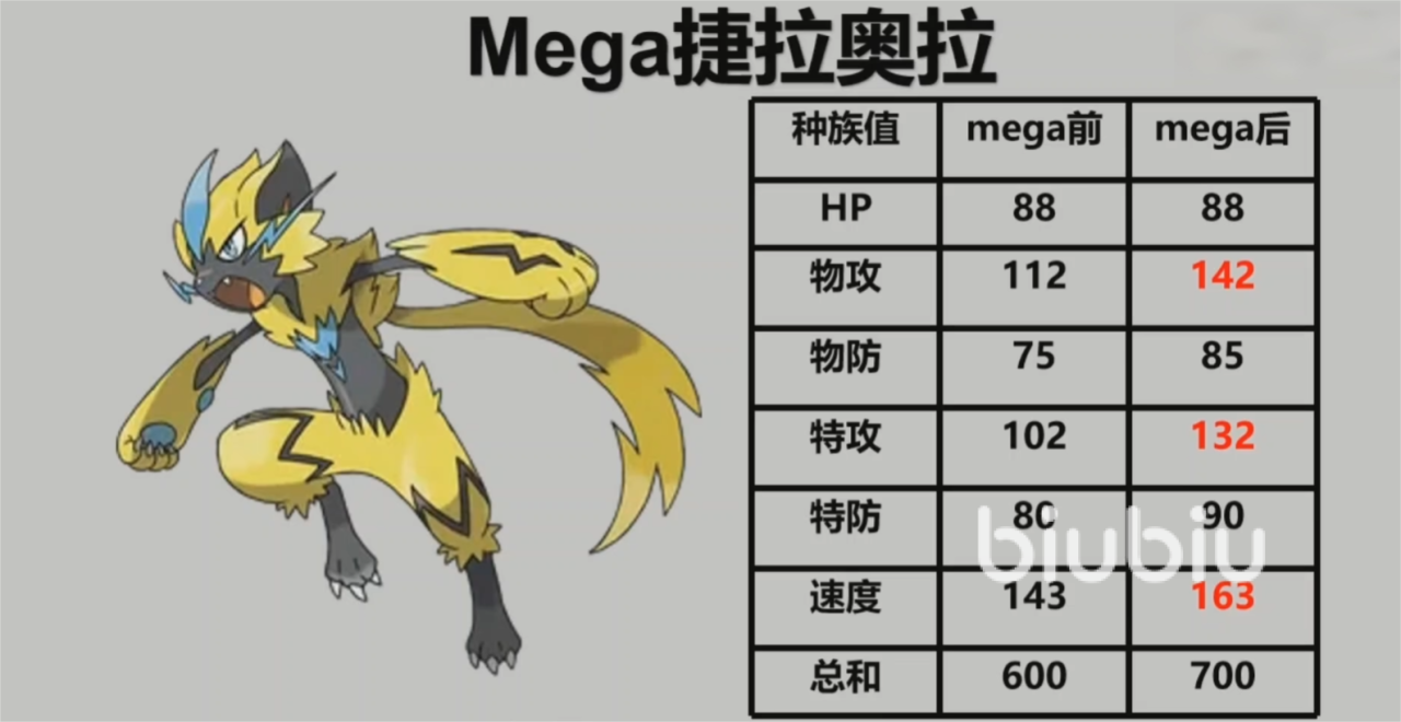 Mega之前的种族值最强的在于速度有着143的种族值,就算不是极致的速度也能先手90%的精灵,非常有出手权的一个精灵,双方和生命不是很强,最优秀的是可以玩双刀,物理攻击和特工都在100左右,在Mega之后最终要的双攻和速度都得到了加强,配合蓄电的天赋,可以在游戏里面作为辅助或者输出横行无阻。