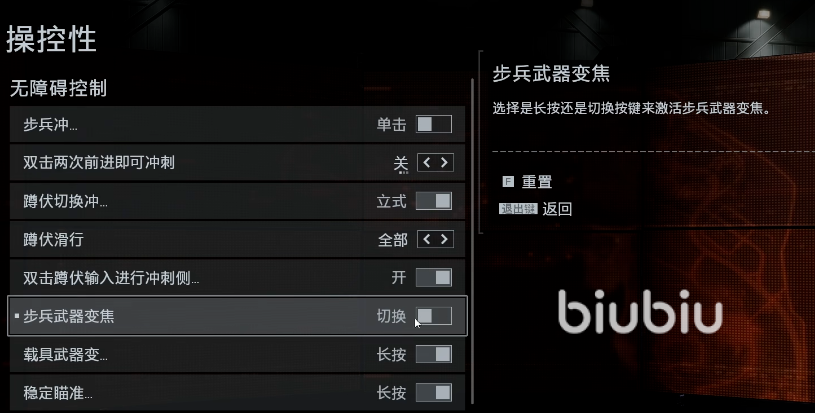 通过设置里的辅助功能,大家可以进行操纵性修改,将步兵武器变焦切换,实战时鼠标右键长按瞄准会改成单点。同时战地六的瞄准镜还有一个功能,可以自动切换成热成像,更方便大家关注敌人动向。