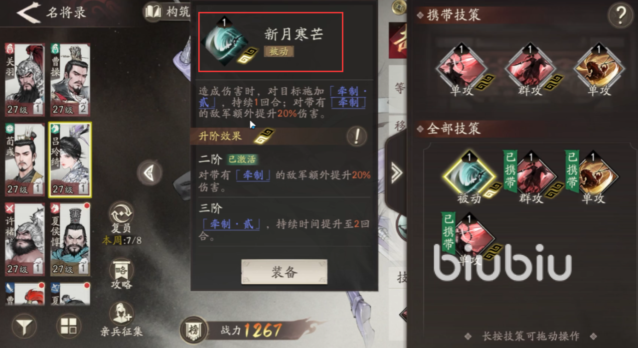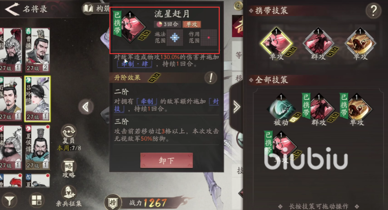 吕玲琦的核心单体技能“流星赶月”拥有长达三回合的冷却时间,但具备极远的施法距离,能够对指定敌军造成130%基础攻击力的伤害,并附加一层牵制效果。当该角色进阶至三阶后,若本回合移动超过三格,则下一次攻击将无视目标50%的防御值,极大提升了破防效率。此时配合臧霸的频繁走位与后台触发机制,可最大化利用此减防优势。