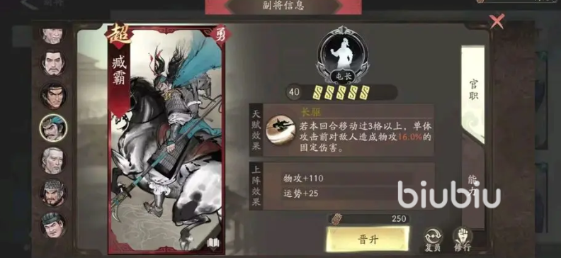 综上所述,臧霸虽不具备前排承伤能力,但凭借其独特的“长驱”机制,在后台输出与团队协同方面表现出色。尽管其适用范围局限于骑兵主将阵容,但在合适的搭配下,依然能发挥出极强的战略价值。建议玩家们根据现有主力阵容灵活调整配置,深入体验臧霸带来的战术多样性。