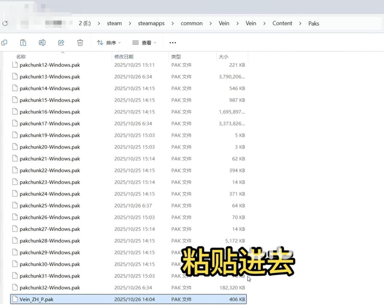 接着点开Paks这个文件夹,将刚刚解压好的汉化文件拖入这个文件夹当中,关闭此页面,重启平台以及游戏,就更改好了。