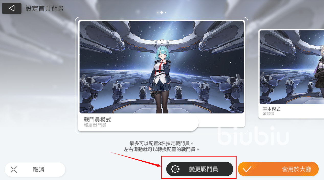 进去设定首页背景页面后,点击下方变更战斗员,出现选择界面,选喜欢的角色之后,点击套用到大厅即可完成更换。最多可以选择三个,选好后在大厅左右滑动就能进行切换。该功能熟悉之后,大家可以根据自己获取角色的进度,随时更换成新角色,每天都会有不同的感受。