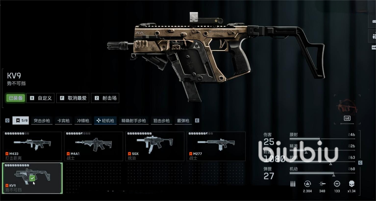 第三把武器是KV9弹夹容量不高是硬伤,但是相对的换来了高射速和高伤害的数值,中距离只要射中5-6枪就能带走敌人,凭借短暂的练习玩家就能操控这把枪的后坐力,也让这把枪的学习成本非常低,组装之后弥补弹夹容量不够的问题,让它的缺点基本上消失。