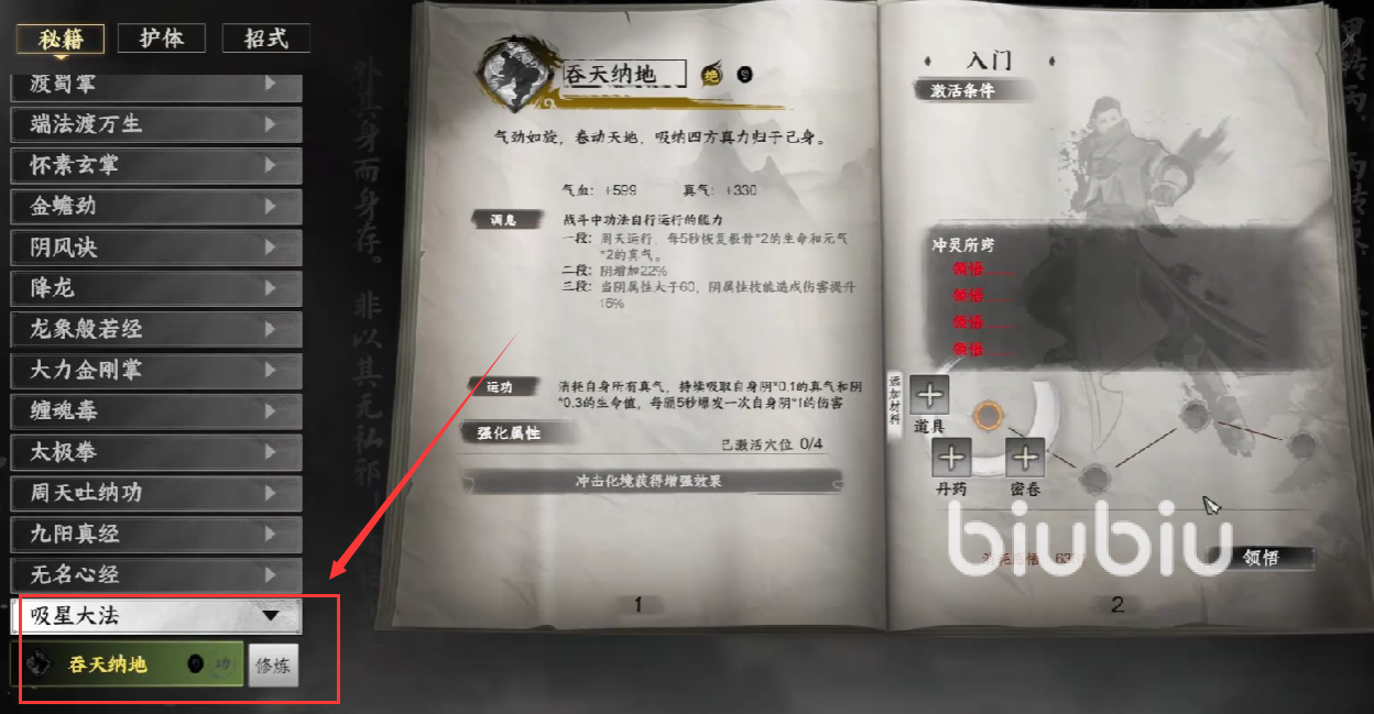 使用吞天纳地需消耗全部真气进入吸纳状态,所吸收的生命与真气数值均会根据角色当前阴属性进行比例换算。每五秒可触发一次爆发效果,造成相当于自身阴属性100%的基础伤害。要完全解锁该心法的所有潜力,玩家需完成四次冲脉突破。