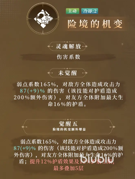 其主动技能名为“险境的机变”,冷却时间为两回合。未觉醒状态下,该技能的基础攻击倍率为87%,弱点系数为165%。当目标处于护盾状态时,伤害将提升至原倍率的200%。这一机制使她在对抗依赖护盾体系的敌方阵容时具备极强的反制能力。