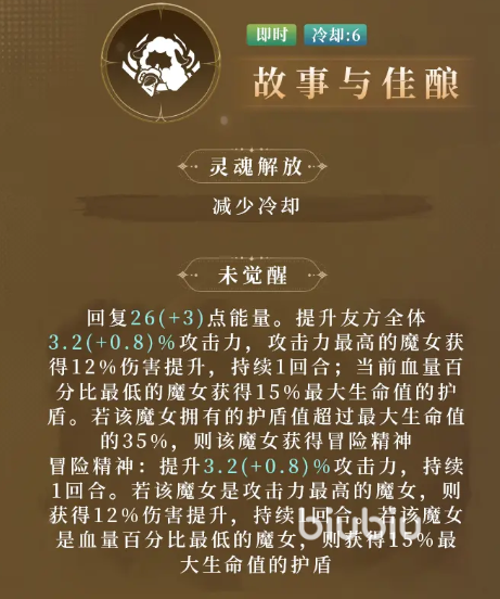 技能觉醒后,“故事与佳酿”的增益效果可触发两次,两层buff允许叠加。若同一单位同时满足“攻击力最高”与“生命值最低”的条件,则可重复获得增益,最高可达40%的伤害提升,极大提升了关键输出位的爆发潜力。