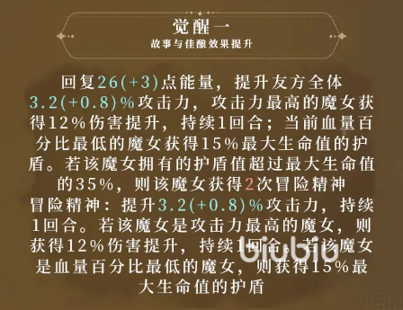 花梨的终极技能“故事与佳酿”专注于团队增益与能量恢复。在未觉醒时,释放该技能可恢复自身26点能量,并提升全体友方3.2%攻击力,其中攻击力最高的单位额外获得12%伤害加成,持续一个回合。