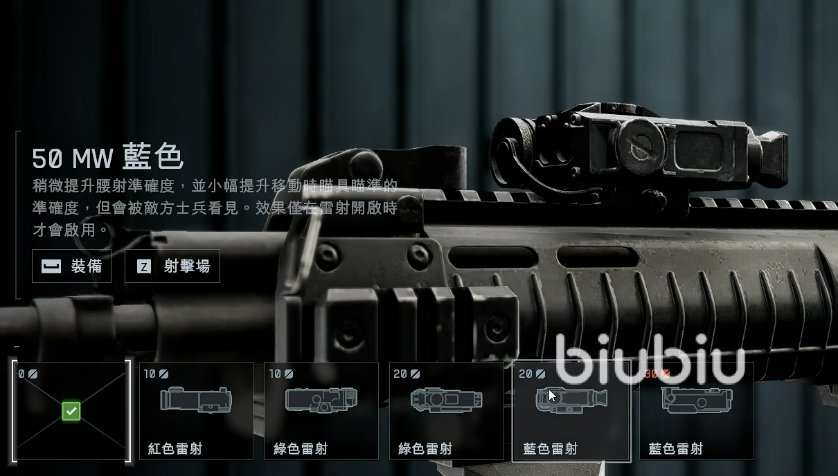 顶部配件:50mW蓝色,提升腰射与近距开镜前的命中率(注意远距离时应收起激光以获得清晰视野)。