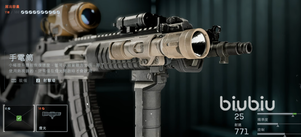 握把:合金垂直握把,显著降低垂直后坐力,配合线性补偿器能让后坐控制得更可预测。