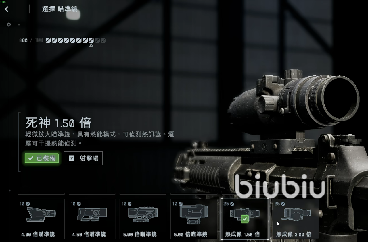 瞄具:热成像1.5倍,最通用的视野,便于在中近距离做快速瞄准,可根据个人习惯更换。