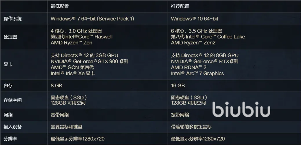 再看其他配置的要求,基本上和上一个版本没多大区别,特别是内存,推荐配置16GB,而最低配置8GB就可以满足了,因此,此前正在玩前作的玩家,基本上不需要提升装备了,不过需要注意的是,由于游戏目前是国际服游戏,所以在基础网络需求上,还需要使用游戏加速器,在此大家可以尝试一下在性能和功能上都已升级的biubiu加速器。