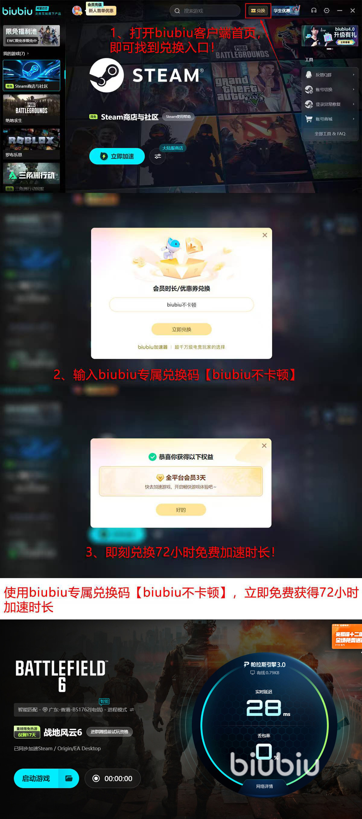 另外,biubiu为了提升客户端体验的效果,邀请职业选手左梓轩做产品体验官,依靠其提供专业建议,对客户端进行了深度优化,现在大家可以通过官方活动获得免费加速体验时长,如使用【biubiu不卡顿】口令,在客户端兑换领取72小时加速时长,新手玩家首次注册后还多有24小时时长,因此新人可获得时间总计有96小时。
