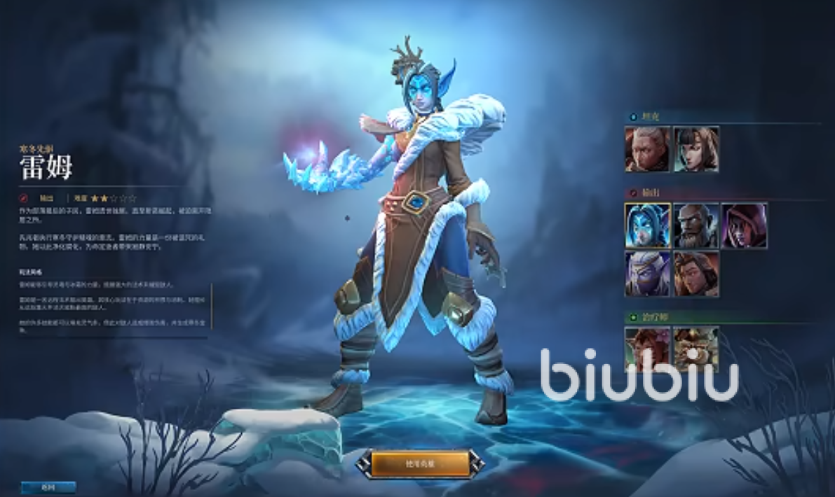 雷姆:属于冰法近战DPS,他用“冰霜箭”攒能“冰冻洪流”,他比较特殊的是AOE技能还自带“寒霜护盾”减伤,这样如果你是新手跟着T输出就可以,不用操心复杂连招,而进阶玩家要是想玩“高爆发+强控场”也可以选,属于比较不挑人的职业。三星操作难度,可以兼顾操作感与输出的爽感。