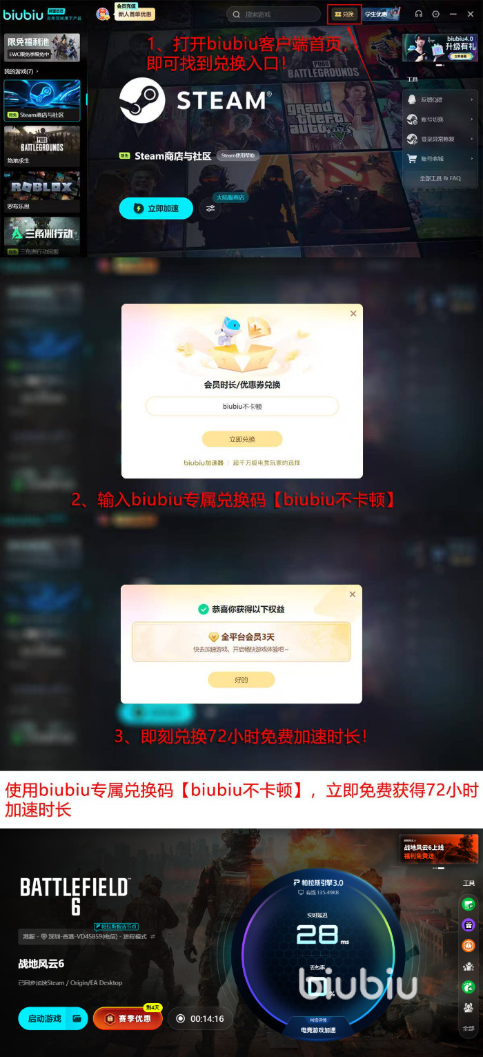 同时,biubiu正式引入全新的帕拉斯引擎3.0,该引擎能根据玩家实时网络状况动态调整传输策略,在延迟高峰期依旧保持流畅连接。相较于普通加速方案,帕拉斯引擎3.0能让玩家在高强度作战中始终保持稳定帧率与无卡顿体验。无论你是追求精准打击的老兵,还是刚加入《战地6》战场的新兵,使用biubiu都能让你的操作反应更接近职业水准,体验更加真实的战地氛围。
