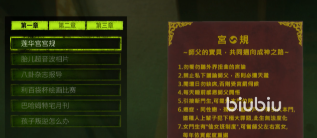 回忆结束来到二楼,进入妈妈的房间,就会看到床头柜那里摆放着文件,打开发现是莲华宫宫规,然后进入下一个房间,就会出现母亲的回忆,因为儿子早逝,丈夫感情也出问题,女主母亲愈发相信莲华教。看完打开房间电脑之后,场景就会切换到台中莲华教。
