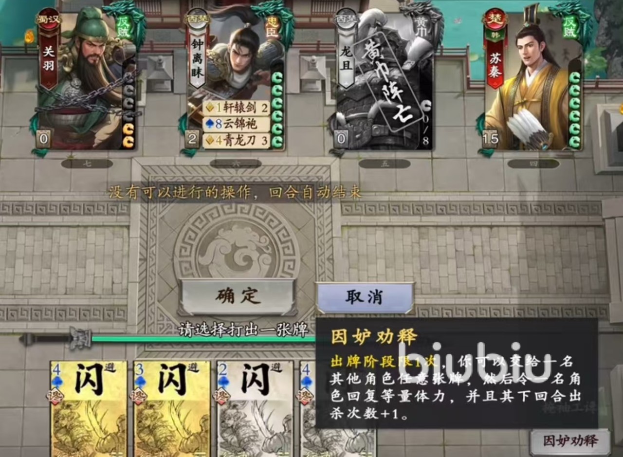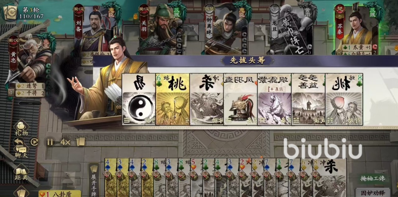 第三个技能“合纵”可在出牌阶段使用,每种场上存在的不同势力均可使该技能的发动次数+1。苏秦自身若持有两个不同势力,也会被视为一种独立势力类型。该技能允许他查看并增强某一名角色手中的一张牌,既可以强化队友的关键牌提升输出,也能通过加强敌方特定牌来引导战局走向。例如,将一张普通【杀】增强为造成两点伤害,实现战术突袭。
