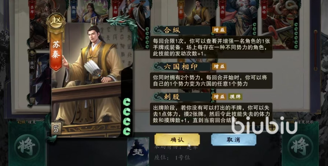 综上所述,苏秦是一位兼具策略深度与操作上限的武将。凭借独特的过牌机制、灵活的势力切换以及强大的牌张干预能力,他在高水平对局中展现出不俗的实力,深受擅长运筹帷幄的玩家青睐。