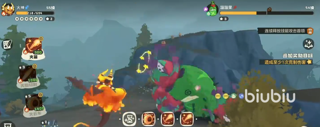 进入对战初期,由于第一阶段结束的影响,蹦蹦果会处于短暂眩晕状态。此时应迅速使用“力量增效”技能,叠加伤害输出效率。不久后,boss将释放七星级草系绝招“光能聚焦”。该技能本身威力极高,再配合首领级单位释放五星级以上技能伤害翻倍的规则,极易造成秒杀。因此,若未选择生命增益,很可能无法承受此次打击。只要成功扛过这一轮爆发,后续利用“火焰切割”、“火苗”等火系技能持续压制,便可稳步取胜。