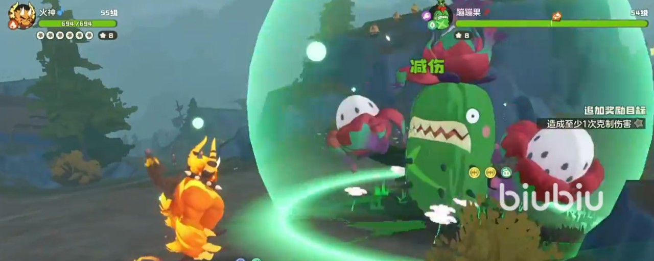 当成功击破其护盾后,系统将提供三项增益选项供选择。若队伍缺乏攻击力加成,推荐优先选取生命值提升效果,以增强生存能力。随后进入第二阶段的精灵对战环节。鉴于蹦蹦果为草系属性,建议直接派出克制它的火系精灵“火神”,以取得属性优势。