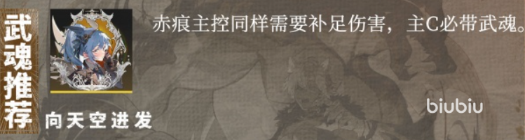 关于装备配置,推荐为赤痕装配名为“向天空进发”的武魂,该武魂能有效弥补其作为副C在伤害输出上的短板,增强其在战场上的功能性。完成武魂绑定后,再搭配合适的词条属性,即可让赤痕在各类挑战中稳定发挥出色战力。